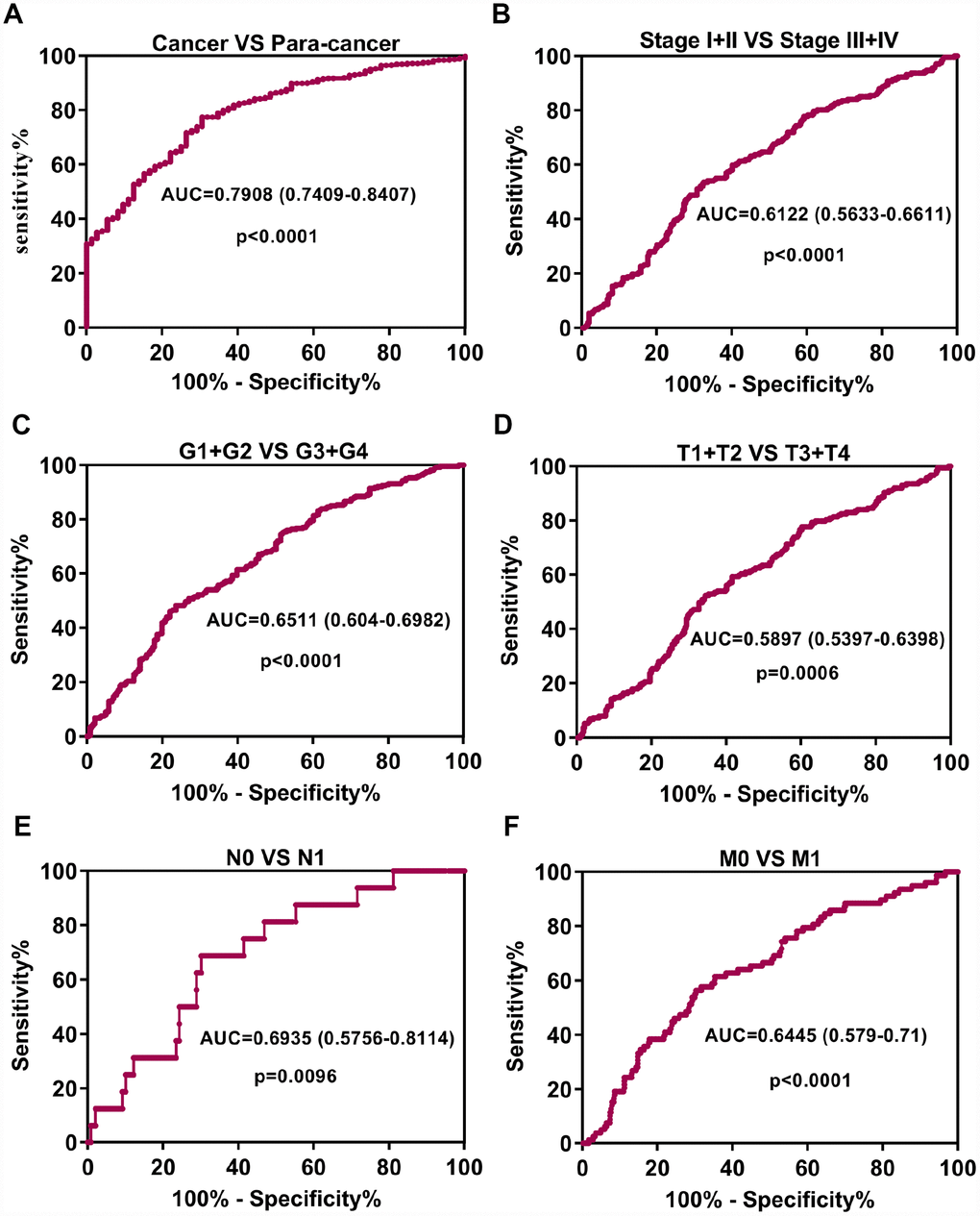 To probe whether the high expression of GPX1 possesses diagnostic significance in ccRCC patients, the ROC curves were used to analyze the diagnostic value of high GPX1 expression in various clinicopathological parameters from TCGA-KIRC datasets. ROC curve analysis showed that GPX1 could statistically distinguish ccRCC from normal tissue producing an area under the curve (AUC) of 0.7908 (95% CI: 0.7409-0.8407; p < 0.0001). Moreover, we performed a ROC curve analysis in the subgroup of ccRCC patients against pathological stage, T stage, N stage, M stage and G stage. Subgroup ROC curve analysis implied that the high expression of GPX1 might have diagnostic value for ccRCC patients with pathological stage (I + II) / (III + IV) (Figure 3B, AUC = 0.6122, p < 0.0001), (G1 + G2) / (G3 + G4) stage (Figure 3C, AUC = 0.6511, p < 0.0001), (T1 + T2) / (T3 + T4) (Figure 3D, AUC = 0.5897, p = 0.0006), N0 / N1 stage (Figure 3E, AUC = 0.6935, p = 0.0096), M0 / M1 stage (Figure 3F, AUC = 0.6445, p < 0.0001). These results implicitly suggested that GPX1 might have diagnostic value for patients with ccRCC.