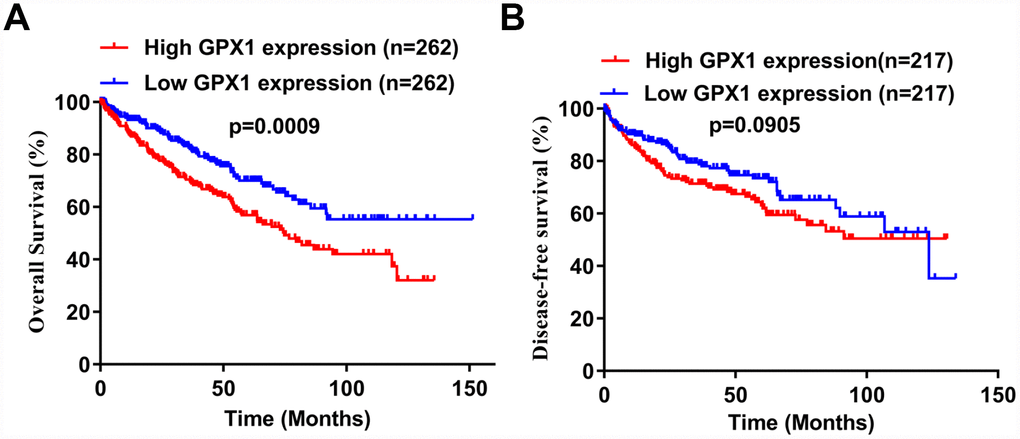 To investigate whether high expression of GPX1 is associated with prognosis in patients with ccRCC, we performed Kaplan-Meier analysis using data from the TCGA-KIRC database. The analysis found that high GPX1 expression predicted a worse overall survival (OS) in ccRCC patients (Figure 4A), however, GPX1 expression does not affect disease-free survival (DFS) (Figure 4B).