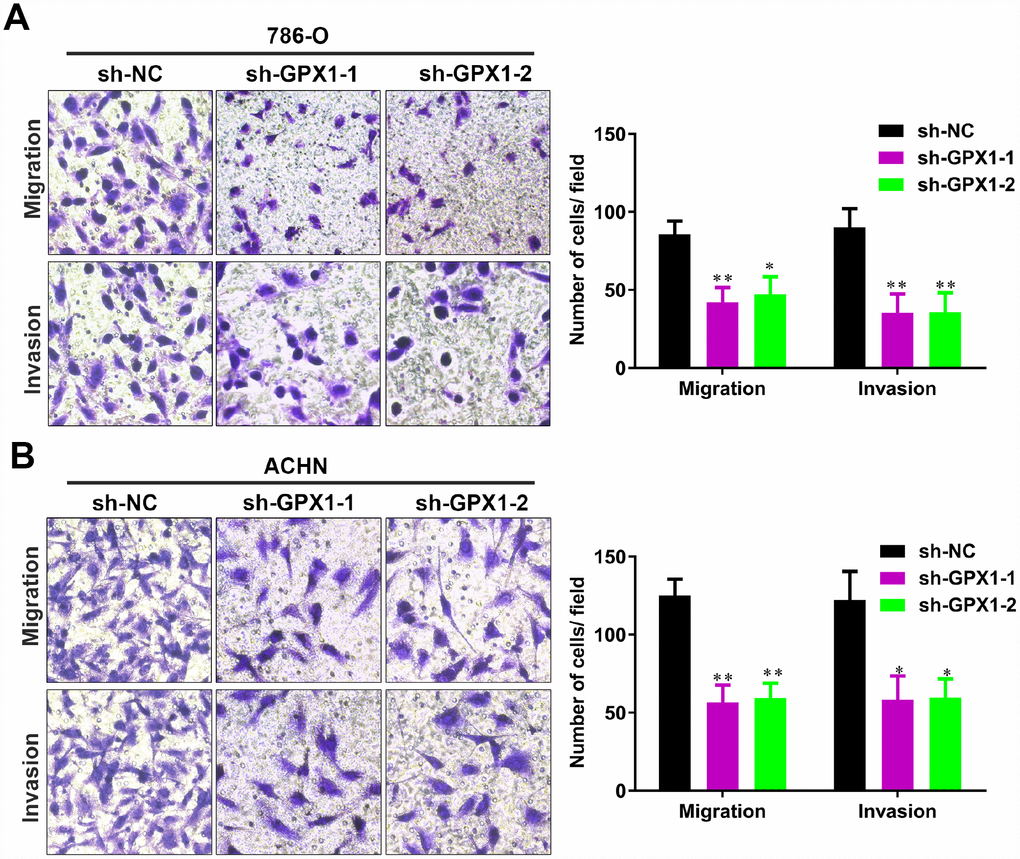 To investigate whether GPX1 affects the migration and invasion of renal cancer cells, we performed the transwell assays. As shown in Figure 7A-B, knockdown of GPX1 significantly reduced the migration and invasion capability of 786-O and ACHN cells. These results reversely suggest that GPX1 promotes migration and invasion of renal cancer cells.