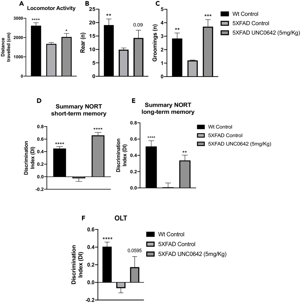 5XFAD treated with UNC0642 restored the locomotor activity in comparison with the 5XFAD Control group (Figure 1A). Likewise, an increase in vertical activity, quantified by the number of rearings, compared to the 5XFAD Control group was found (Figure 1B). By last, a significant increase in grooming in 5XFAD treated with UNC0642 in comparison with 5XFAD Control group was found (Figure 1C). All these parameters were significantly altered in 5XFAD Control in comparison with Wild-type (Wt) Control (Figure 1A–1C). Additional parameters measured in the Open Field Test (OFT) are presented in Table 1.