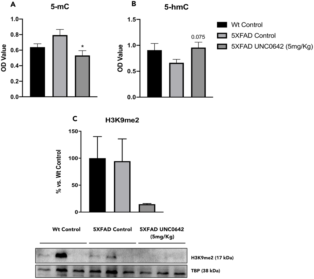 UNC0642 treatment decreased 5-mC, increased 5-hmC and reduced the hippocampus H3K9me2 levels in 5XFAD mice