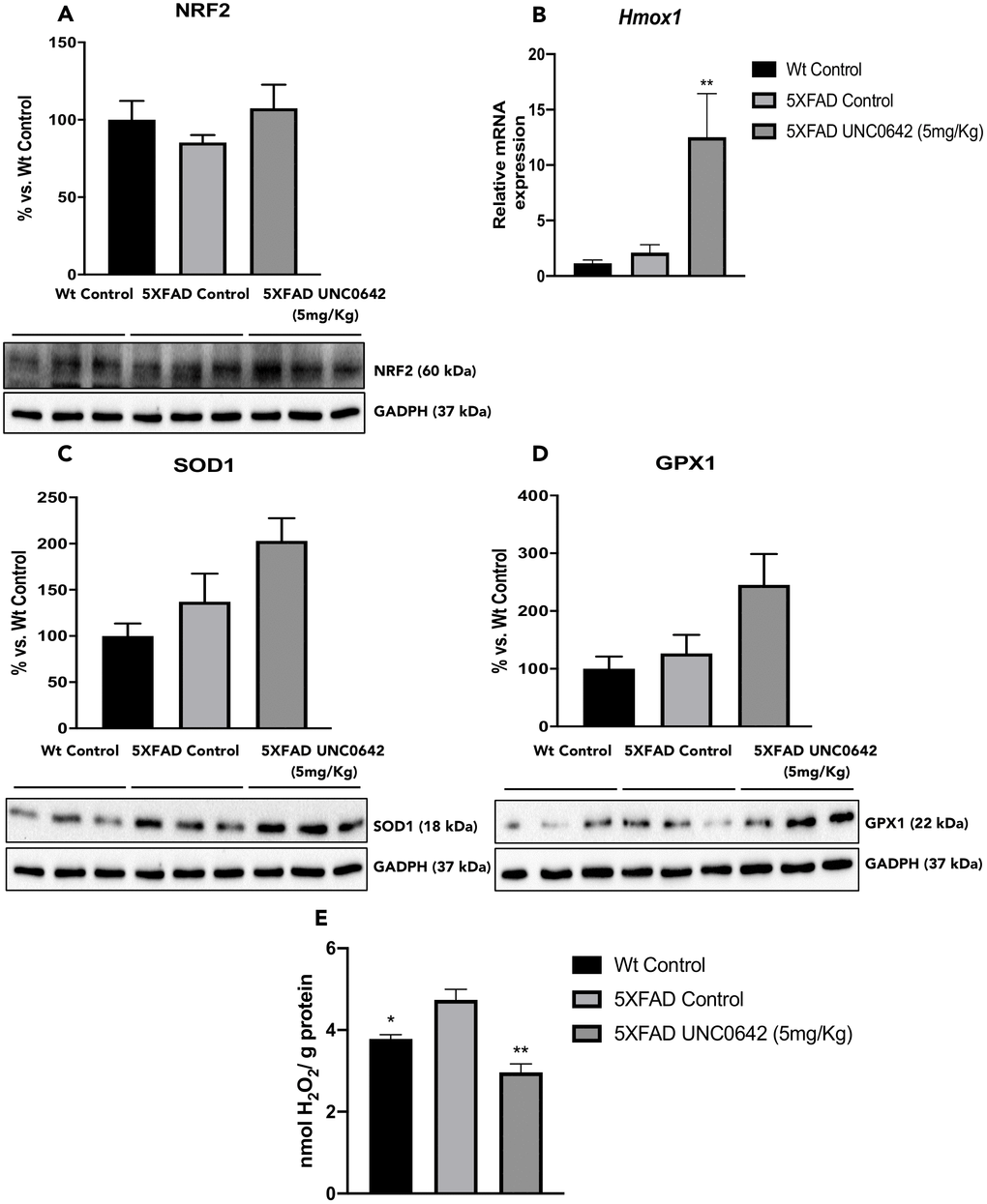 To address the question of whether UNC0642 treatment reduces OS by upregulating the Nuclear factor erythroid-2-related factor 2 (NRF2) pathway, we evaluated protein levels of the transcription factor NRF2. We found increased in NRF2 protein levels in 5XFAD treated with UNC0642 compared to the 5XFAD Control mice group (Figure 3A). In parallel fashion, the expression of NRF2 targets was increased in animals treated with UNC0642. Specifically, Heme oxygenase decycling 1 (Hmox1) gene expression, Superoxide dismutase 1 (SOD1) and Glutathione peroxidase 1 (GPX1) protein levels were increased in 5XFAD treated with UNC0642 in comparison with the 5XFAD Control group, being only significant for the Hmox1 gene expression (Figure 3B–3D). Furthermore, no changes were found between both Control mice groups, demonstrating the activation of the NRF2 pathway through the inhibition of the G9a/GLP.
