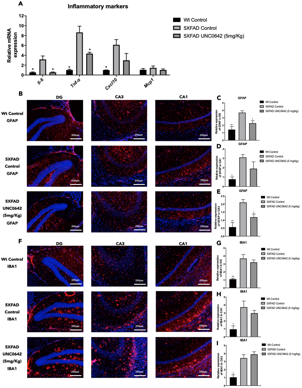 On the other hand, immunostaining quantification of Glial fibrillary acidic protein (GFAP) fluorescence intensity revealed that UNC0642 treatment reduced GFAP staining, especially in the Dentate Gyrus (DG) and CA3 regions, reaching it to Wt Control (Figure 4B–4E). However, no changes in the immunostaining quantification of Ionized calcium binding adapter molecule 1 (IBA1) between 5XFAD treated with UNC0642 and 5XFAD Control were found (Figure 4F–4I), whereas a significant reduction of IBA1 immunostaining quantification in Wt Control in comparison with 5XFAD Control was determined (Figure 4F–4I).