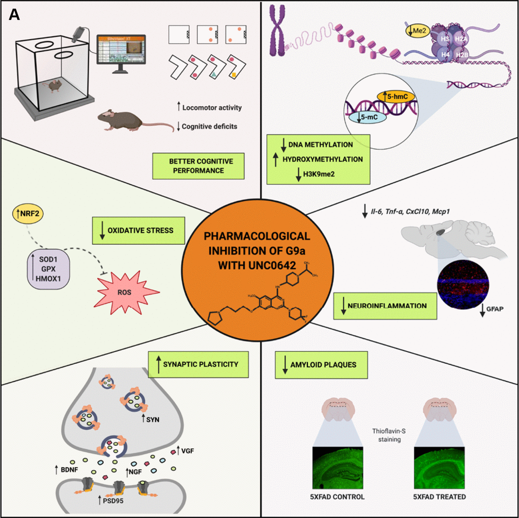 The present work aimed to evaluate the beneficial effects of the pharmacological inhibition activity of G9a/GLP with UNC0642 in 5XFAD mice, evaluating epigenetic changes, cognitive improvement, and the influence of the G9a/GLP complex inhibition in amyloid pathology, OS, neuroinflammation, and neuronal plasticity.