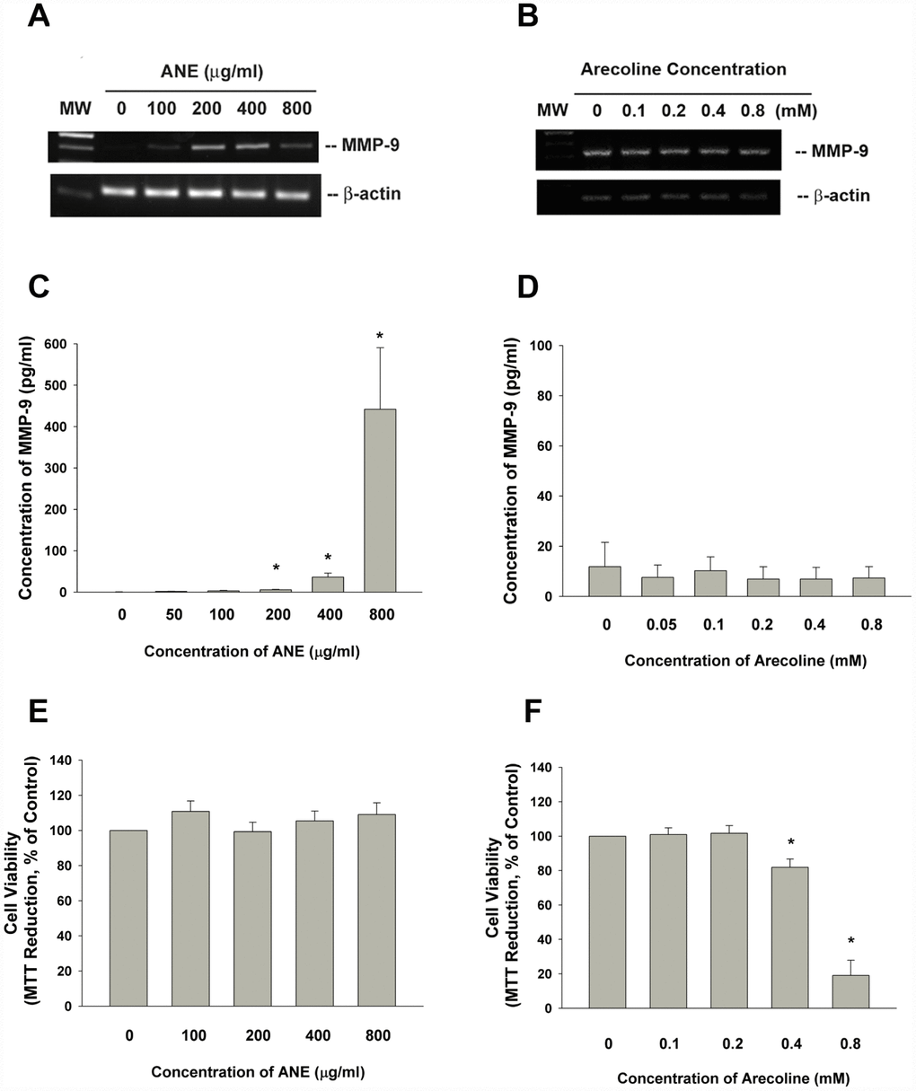Briefly 5 x 105 cells were inoculated onto 6-well culture wells in 2 ml medium. After 24 hours, medium was changed with fresh medium containing various concentrations of ANE (100-800 μg/ml) or arecoline (0.05-0.8 mM) for 24 hours. Culture medium was collected for ELISA analysis of MMP-9 secretion as before [8, 45, 46]. Total RNA was isolated for semi-quantitative RT-PCR.