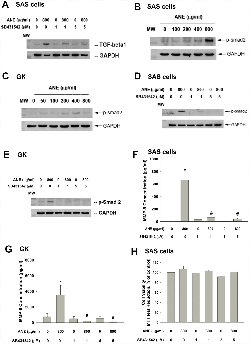 Briefly near confluent GK (in 6-well) or SAS cells (1 × 106 cells) were cultured on 10-cm culture dishes. They were then exposed to different concentrations of ANE (100–800 μg/ml) for 24 hours. Protein from cell lysates were collected and subjected to western blotting analysis as described previously [11, 12], except that TGF-β1 and p-Smad2 antibodies were used as primary antibodies. In some experiments, SB431542 was used for pretreatment and co-incubation with ANE (800 μg/ml) for 24 hours before cell harvesting.