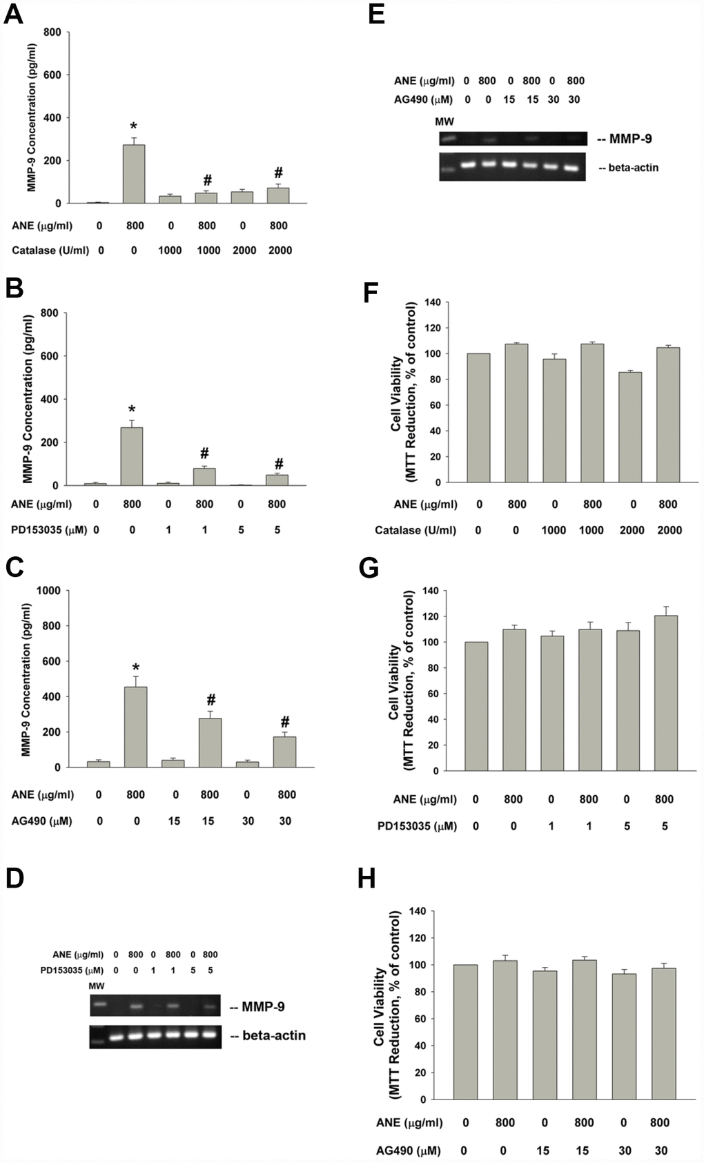 Effect of Catalase, PD153035 and AG490 on ANE-induced MMP-9 production