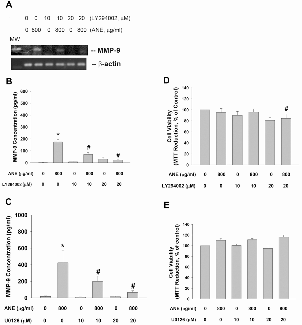 Role of PI3K/Akt and MEK/ERK in ANE-induced MMP-9 expression/secretion