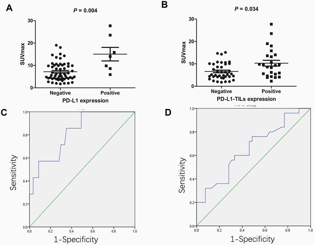 We next determined the SUVmax threshold to predict the status of PD-L1/PD-L1-TILs. ROC analysis demonstrated that the highest accuracy (67.2%) to predict PD-L1 status was obtained when the SUVmax threshold was 8.55, resulting in area under curve of 0.822±0.075. The sensitivity and specificity for the prediction of PD-L1 status was 85.7% (6/7) and 64.9% (37/57), respectively (Figure 1C). Likewise, ROC analysis also demonstrated that the highest accuracy (64.2%) for the prediction of PD-L1-TILs expression was obtained with a SUVmax cutoff value of 7.9, resulting in area under curve of 0.658± 0.07. Similarly, the sensitivity and specificity for the prediction of PD-L1-TILs status was found to be 60.0% (15/25) and 66.7% (26/39), respectively (Figure 1D).