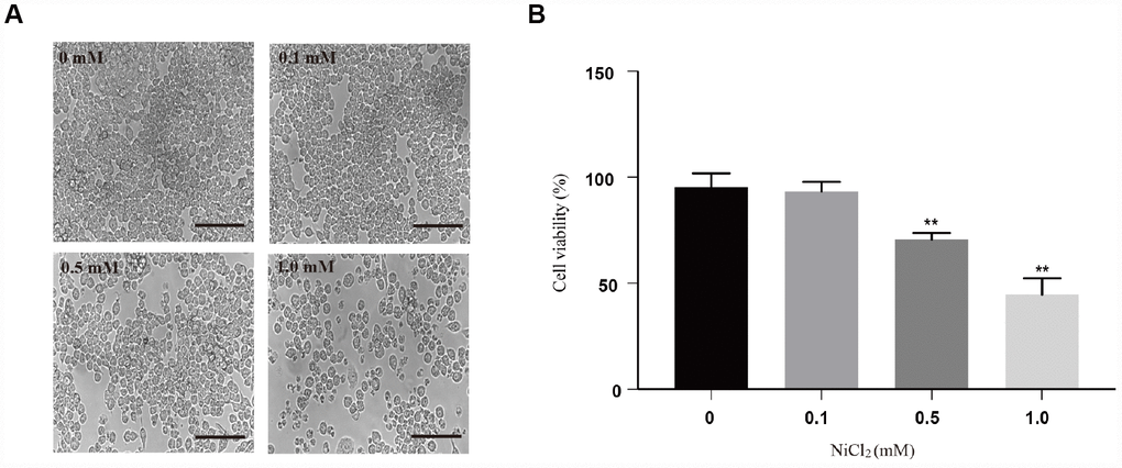 Our previous work has shown that NiCl2 can inhibit the immune response in chicken. To evaluate the cytotoxicity of NiCl2, BMDMs were exposed to various doses of NiCl2 (0, 0.1, 0.5 and 1.0 mM) for 24 h. It was found that NiCl2 suppressed BMDMs viability in a dose-dependent manner (Figure 1A and 1B). Notably, the viabilities of BMDMs were significantly (p < 0.01) decreased in 0.5 and 1.0 mM NiCl2 exposure groups compared to control group.