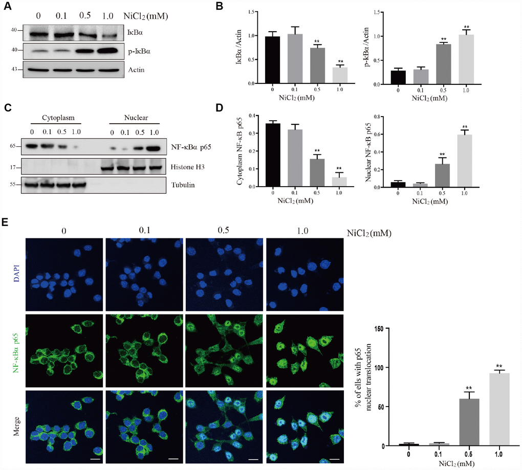 To investigate the inflammatory potential of NiCl2, NF-κB pathway was tested. The activation of NF-κB transcription factor may trigger an inflammatory response [15]. NF-κB proteins are bound and inhibited by IκBα proteins. NiCl2 treatment increased the phosphorylation levels of IκBα protein expression, and decreased the total IκBα protein expression levels (Figure 2A and 2B). Phosphorylation of IκBα caused its ubiquitination and proteasomal degradation, freeing NF-κB complexes. In Figure 2C and 2E, the results showed that NF-κB was translocated to the nucleus, and thus inducing target gene expression.