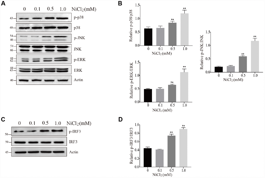 Interferon regulatory factor 3 (IRF3) can suppress cell proliferation and regulate the expression levels of genes related to innate immunity [29]. As shown in Figure 3C and 3D, NiCl2 exposure markedly (p < 0.01) increased the protein expression levels of p-IRF3.