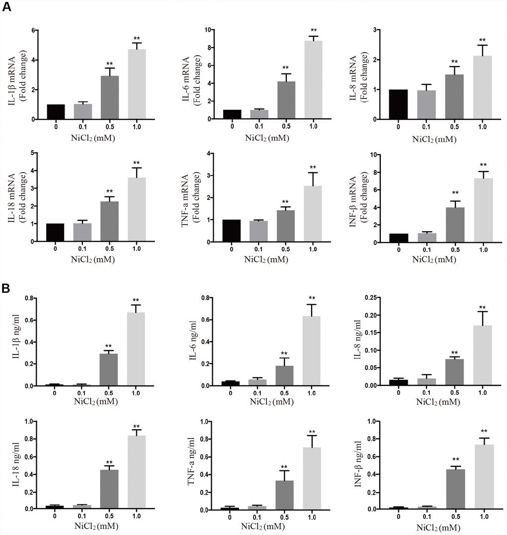 The above results showed that NiCl2 activated NF-κB, MAPKs and IRF3 pathways, by upregulating the expression levels of pro-inflammatory cytokines. In Figure 4A, the mRNA expression levels of IL-1β, -6, -8, -18, TNF-α and IFN-β were remarkably (p < 0.01) increased in 0.5 and 1.0 mM NiCl2 exposure groups compared to those in control group. The ELISA data revealed that NiCl2 treatment markedly (p < 0.01) increased the production of IL-1β, -6, -8, -18, TNF-α and IFN-β (Figure 4B).