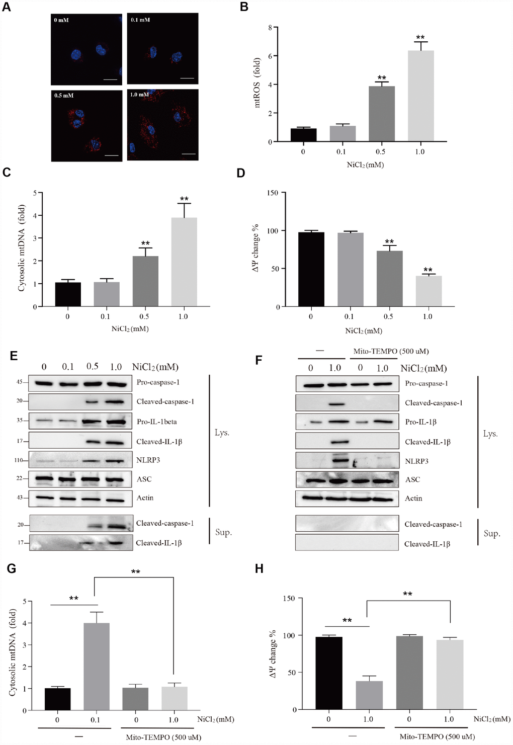 The mechanism underlying NiCl2-induced caspase-1 activation was explored in this study. The results showed that NiCl2 induced mitochondria damage such as increase of mitochondrial ROS (mtROS) production (Figure 5A and 5B), elevation of mitochondrial DNA (mtDNA) release (Figure 5C) and decrease of mitochondrial membrane potential (Figure 5D). We further assessed whether mitochondria-specific ROS production is associated with NiCl2-induced activation of caspase-1. Mito-TEMPO, a mitochondria-specific ROS scavenger, suppressed the formation of cleaved-IL-1β and cleaved-caspase-1 in BMDMs in response to NiCl2 (Figure 5F). Additionally, Mito-TEMPO attenuated the elevation of mtDNA release and loss of mitochondrial membrane potential (Figure 5G and 5H). These data demonstrate that NiCl2-induced caspase-1 activation largely relies on the mitochondrial generation of ROS.