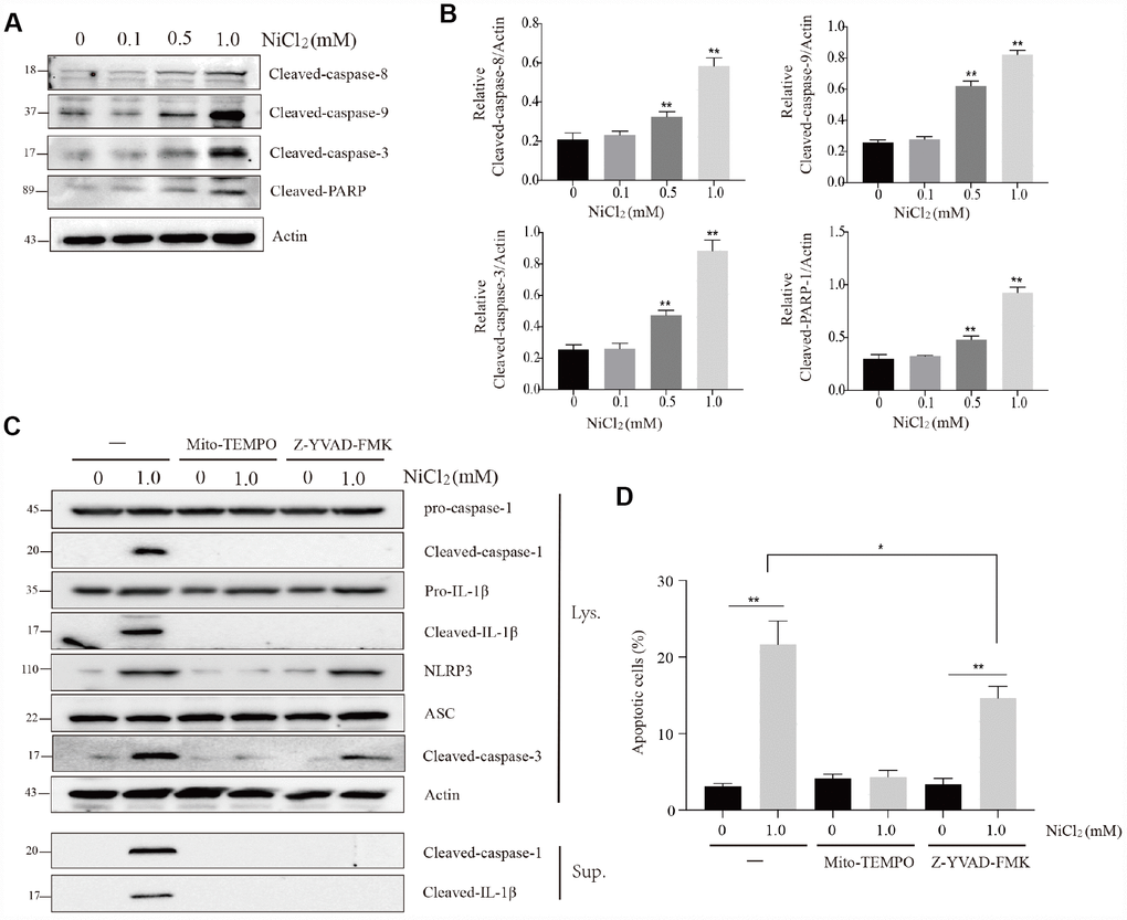 Cotreatment with NiCl2 and Mito-TEMPO suppressed the cleavage of caspase-1, -3 and IL-1β (Figure 6C). Cotreatment with NiCl2 and Z-YVAD-FMK, a potent inhibitor of caspase-1, suppressed the cleavage of IL-1β and caspase-1 (Figure 6C). However, the caspase-1 inhibitor only partly inhibited the cleaved-caspase-3 protein expression (Figure 6C). The percentage of apoptosis was significantly (p < 0.01) higher in NiCl2 treatment groups and NiCl2+Z-YVAD-FMK treatment group than that in control group (Figure 6D).