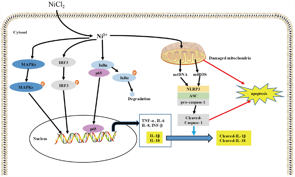 In summary, this study reveals that NiCl2 triggers the transcription levels of pro-inflammatory cytokines, including IL-1β, -6, -8, -18, TNF-α and INF-β in BMDMs through NF-κB, MAPKs and IRF3 signaling pathways. Moreover, NiCl2 stimulates caspase-1 activation via NLRP3 inflammasome activation. Furthermore, NiCl2 induces apoptosis through mitochondrial ROS-mediated pathway, and the activation of NLRP3 inflammasome can contribute to apoptotic process (as shown in the Figure 7).
