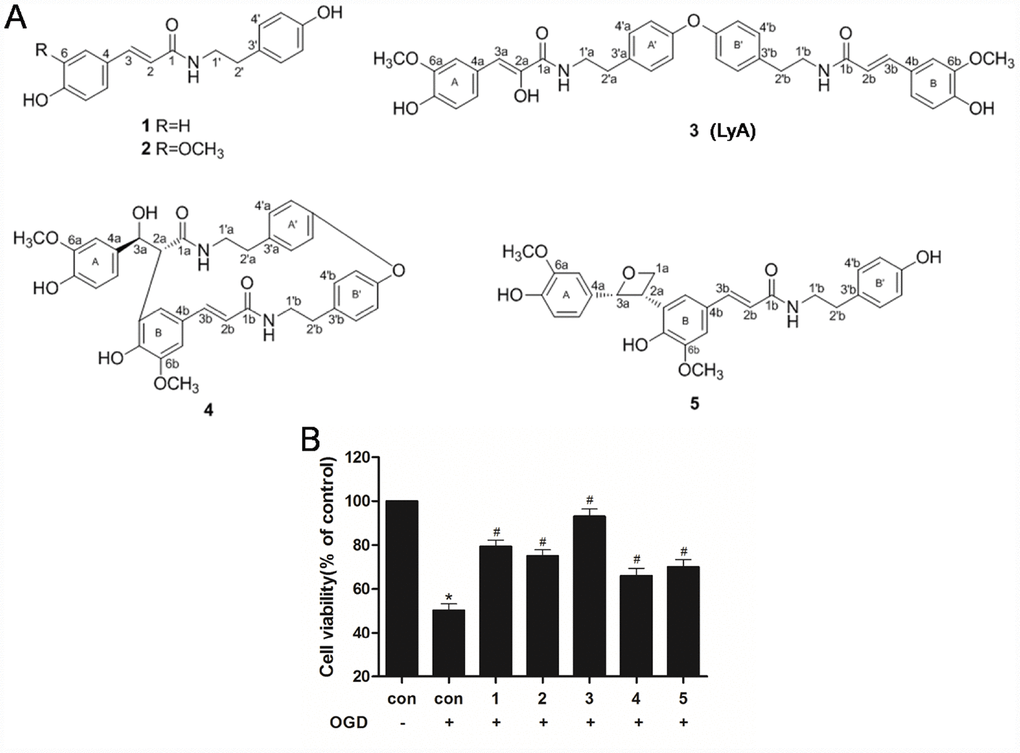 Human neuroblastoma SH-SY5Y cells were cultured in DMEM supplemented with 10 % (v/v) fetal bovine serum, 100 unit/ml penicillin and 100 μg/ml streptomycin (Life Technologies). For differentiation experiments, SH-SY5Y cells were cultured in a mixture containing 1:1 Ham’s F12 and DMEM supplemented with 10 % (v/v) FBS, 100 U/ml penicillin, and streptomycin. After 24 hours, 10 μM ATRA was added into the medium to stimulate the cells to differentiate. The cells were grown at 37 °C in a 5 % CO2/95 % air humidified atmosphere. Cells were seeded on poly-L-lysine-coated plates and passaged at 70 %–80 % confluence. Experiments were carried out 24 h after the SH-SY5Y cells were seeded onto plates or dishes at an appropriate density. Cells were treated with phenolic amides (1-5) (40 μM) or different concentrations of LyA (10, 20, 40 μM) for 8 h before oxygen and glucose deprivation (OGD). To simulate ischemia-like conditions in vitro, cells were exposed to instantaneous OGD for 60 min. Then the cells were incubated again in the incubator with 5 % CO2 / 95 % air to terminate the OGD and start reperfusion for 24 h.
