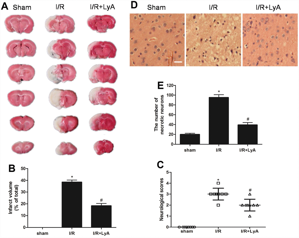 Animals were randomly divided into three groups using the random number table generated by SPSS 18.0 (SPSS Inc., Chicago, IL, USA): sham, I/R, and I/R + LyA. Sham-operated rats underwent surgery and exposed right ICA and right ECA, but did not suffer MCAO. The MCAO rats were administered the physiological saline or LyA (40 mg/kg) by peritoneal injection immediately after the surgery. In all the three groups, eight rats were used for infarct size measurement, six rats were used for hematoxylin–eosin (HE) staining and necrotic neurons, six rats were used for determination of oxidative stress, six rats were used for western blotting, and six rats were used for immunostaining. In our preliminary experiment, using different doses of LyA (20, 40 and 80 mg/kg), 40 mg/kg could significantly reduce infarct volumes and improve neurological deficit scores in rats, but there was no difference between 40 mg/kg and 80 mg/kg.