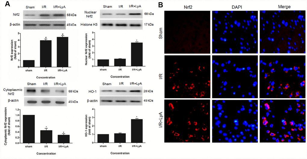 To determine whether Nrf2 or/and HO-1 are involved in the neuroprotective effect of LyA, we analyzed ischemic brain tissue by western blot. As shown in Figure 3A, compared with the sham group, I/R group and LyA + I/R group increased the expression of total Nrf2 protein, but LyA does not significantly increase the expression of total Nrf2 compared to the I/R group. Treatment with LyA obviously increased the protein expression of nuclear Nrf2 and cytoplasmic HO-1 (Figure 3A) (p < 0.05). And Nrf2 was accumulated in the nucleus while cytoplasmic Nrf2 levels were decreased (Figure 3A).