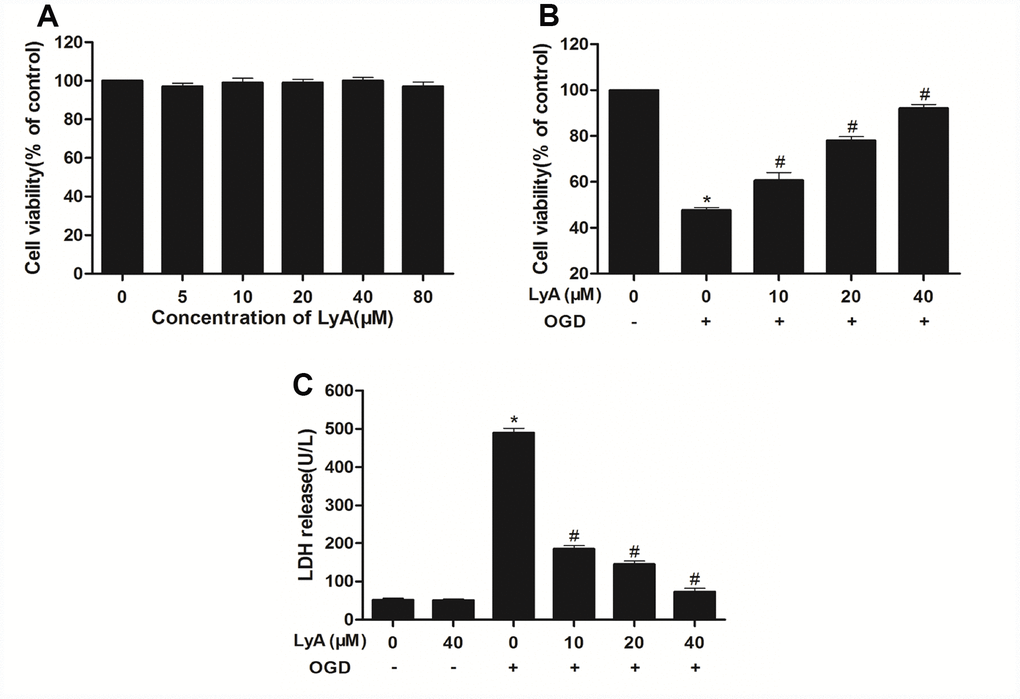 To further investigate the protective effect of LyA against OGD-induced cytotoxicity, the LDH leakage was measured. As shown in Figure 4C, the LDH release in OGD group was much more than the control group (p < 0.05). Conversely, LyA (10, 20, 40 μΜ) treatment lowered the LDH release in a dose-dependent manner. LyA alone had no effect on LDH levels.