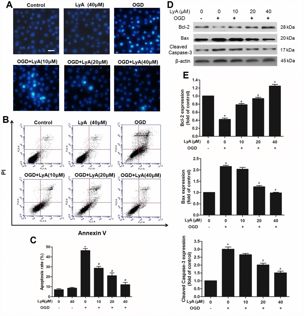 As shown in Figure 5A, after OGD, the SH-SY5Y cells showed that the apoptotic cell nucleus was converted into light blue fluorescence contrasted to viable cell with faint blue fluorescence. However, treatment with different concentration of LyA (10, 20, 40 μΜ) reduced the apoptotic cells in a concentration-dependent manner.