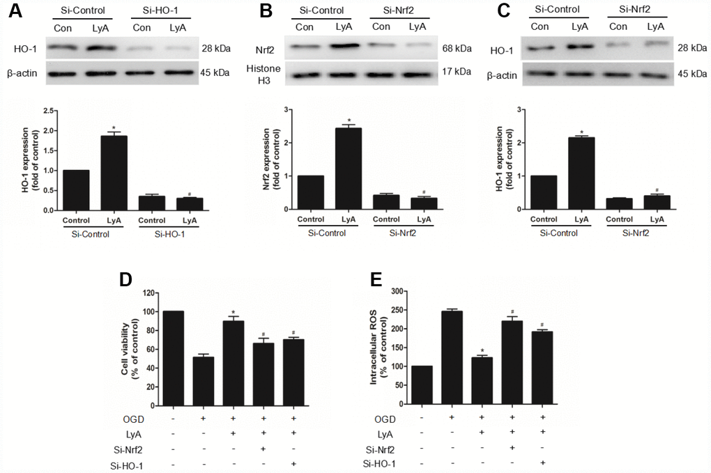 To confirm the role of Nrf2/HO-1 pathway in LyA-mediated neuroprotection, we transfected differentiated SH-SY5Y cells with control (si-control), HO-1- specific (si-HO-1), or Nrf2-specific (si-Nrf2) siRNA for 48h. The efficiency of RNA interference was evaluated by western blot. As shown in Figure 7, HO-1 siRNA obviously decreased the expression of HO-1 under vehicle or LyA treatment, but control siRNA didn’t have such effect (Figure 7A). Similar to the HO-1 knockdown results, Nrf2 knockdown significantly reduced Nrf2 nuclear translocation and HO-1 expression (Figure 7B and 7C). In cell survival experiment, knockdown of Nrf2 or HO-1 inhibited increased cell viability of LyA under OGD (Figure 7D). Consistently, knockdown of Nrf2 or HO-1 increased ROS level compared to the si-control group, respectively (Figure 7E). Taken together, LyA effectively exerted anti-oxidative damage by activating Nrf2/HO-1 pathway.