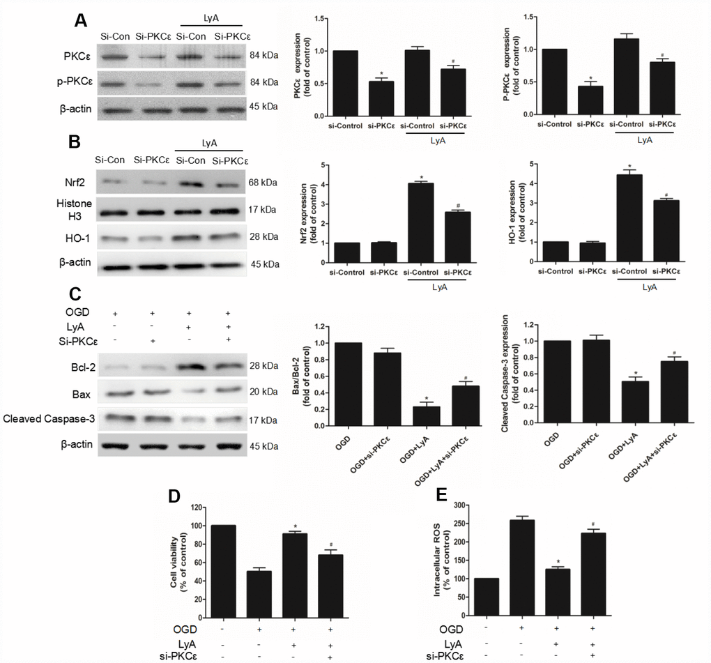 To investigate the role of PKCε in LyA-induced neuroprotection, siRNA was used to knockdown PKCε. The efficiency of RNA interference was evaluated by western blot. As shown in Figure 8, PKCε siRNA obviously decreased the expression of p-PKCε and PKCε under vehicle or LyA treatment, but control siRNA didn’t have such effect (Figure 8A). Moreover, in siRNA group LyA failed to induce nuclear translocation of Nrf2, upregulation of HO-1, and whereas control siRNA had no such effect (Figure 8B and 8C). The Bax/Bcl2 ratio and the expression of cleaved Caspase-3 were down-regulated by LyA pretreatment, which was reversed by PKCε-targeted siRNA (Figure 8D). Similar in cell survival experiment, knockdown of PKCε inhibited increased cell viability of LyA under OGD (Figure 8E). Consistently, knockdown of PKCε increased ROS level compared to the si-control group, respectively (Figure 8F). The above results suggested that LyA-induced neuroprotection was highly dependent on an increase in PKCε expression, possibly through its effect on activation of antioxidant pathways such as Nrf2/HO-1.