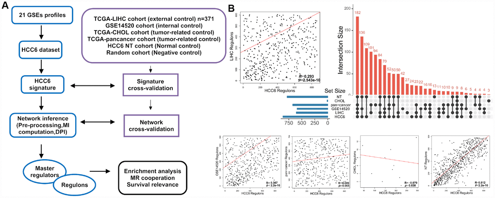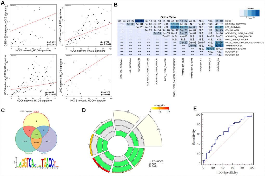 To assess whether our results on the HCC6 dataset are consistent with other tumor-profiling datasets, we applied RTN on The Cancer Genome Atlas Liver Hepatocellular Carcinoma (TCGA-LIHC) data collection (external control), and on GSE14520 (internal control), etc, independently (Figure 1A). The enrichment P-value for each regulon was used to rank MRs identified in each network and the correlation statistic ® between these lists was compared.