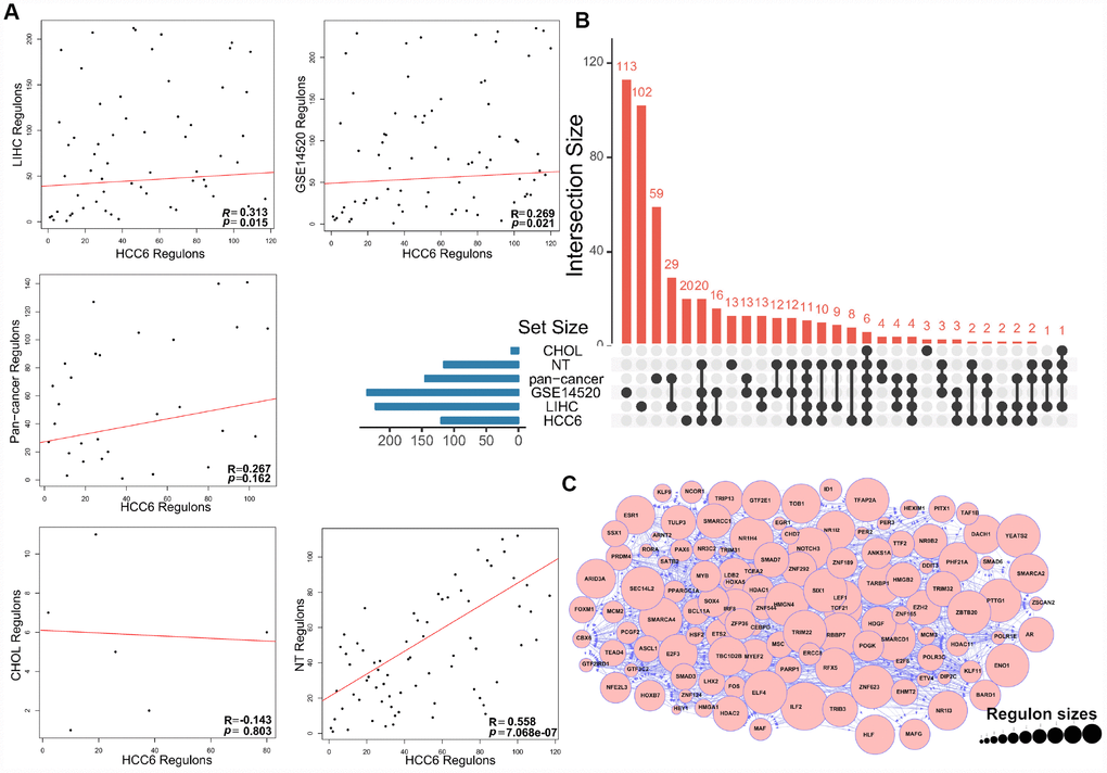 To define a smaller set of conserved MRs, we selected the regulons showing significant enrichment across the HCC6, LIHC, and GSE14520 cohorts (Figure 5A). The association map of the resultant 44 MRs is provided in Figure 5B.
