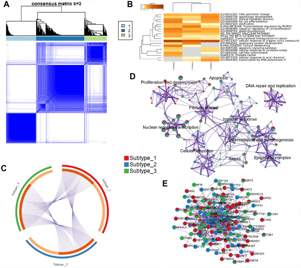 We next performed MRA analysis within the HCC subtypes, interpreting subtype-related MRs using Metascape [34]. Associations with ‘cellular response to organic cyclic compound’, ‘nuclear receptor transcription pathway’, ‘chromatin organization’, ‘regulation of cell cycle process’, and ‘hormone- mediated signaling pathway’, among others, were defined for all three HCC subtypes (Supplementary Table 4). Subtype 1 was associated with biological processes such as ‘mitochondrial biogenesis’, ‘gland, mesenchyme, epithelium and tubule development’, ‘circadian clock’, and FOXM1 and NOTCH3 pathways, among others. Subtype 2, containing the BHC (BRAF-HDAC) and the CoREST-HDAC complexes, was linked to ‘cellular response to drug, and antibiotic’, ‘cellular glucose homeostasis’, ‘positive regulation of DNA repair’, ‘telomerase pathway’, and AR and MYC pathways, among others. Subtypes 1 and 2 both showed activated AKT signaling. Lastly, subtype 3 was defined by transcriptional networks related to ‘cellular response to oxygen levels’, ‘oncogene induced senescence’, ‘repression of WNT target genes’, ‘T-helper 17 type immune response’, ‘stem cell proliferation’, and ‘TGF-beta signaling pathway’, among others.