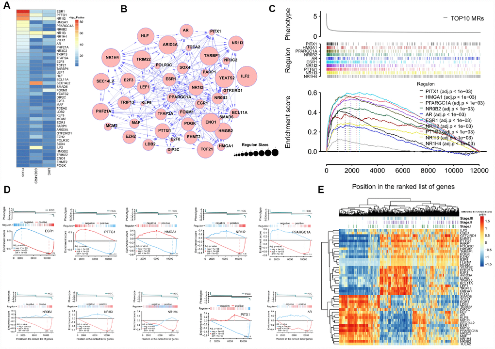 Once identified, we further tested the responsiveness of each regulon to tumor phenotype using gene set enrichment analysis (GSEA) [35]. Figure 5C shows that the top 10 regulons are consistently HCC-responsive. Regulons consist of both MR-induced and MR-repressed genes, and their relative activity influences the phenotype. To evaluate regulon activity, two-tailed GSEA was performed to calculate differential enrichment scores (dES) based on positively and negatively regulated regulon subsets in HCC samples. Detailed target information for each MR is provided in Supplementary Table 6.