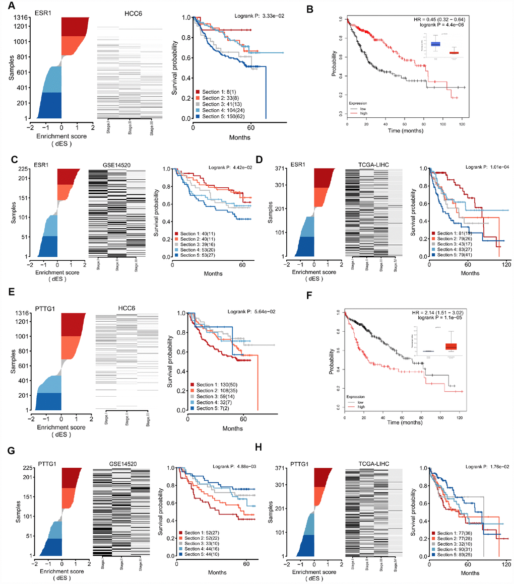 Figure 6 shows dES and survival plots for the top 2 regulons. For the ESR1 regulon, we found a continuous spectrum of dES across the tumors, except near the transition between its active and repressed state, which was characterized by an abrupt change. There was a strong trend for better survival in tumors with high dES. Significant trends were also noted after analyzing the GSE14520 and the LIHC cohorts, evaluated as controls (Figure 6C–6D). Upon stratification for ESR1 expression only, this MR was strongly correlated with prognosis in the LIHC cohort (Figure 6B), but not in the GSE14520 cohort (Supplementary Table 7). Meanwhile, an opposite survival trend was found for the PTTG1 regulon (Figure 6E–6H). These results suggest that regulon activity, expressed as dES, can predict survival outcome in a more context-dependent manner. Detailed MR-based survival analysis results are provided in Supplementary Figure 4.