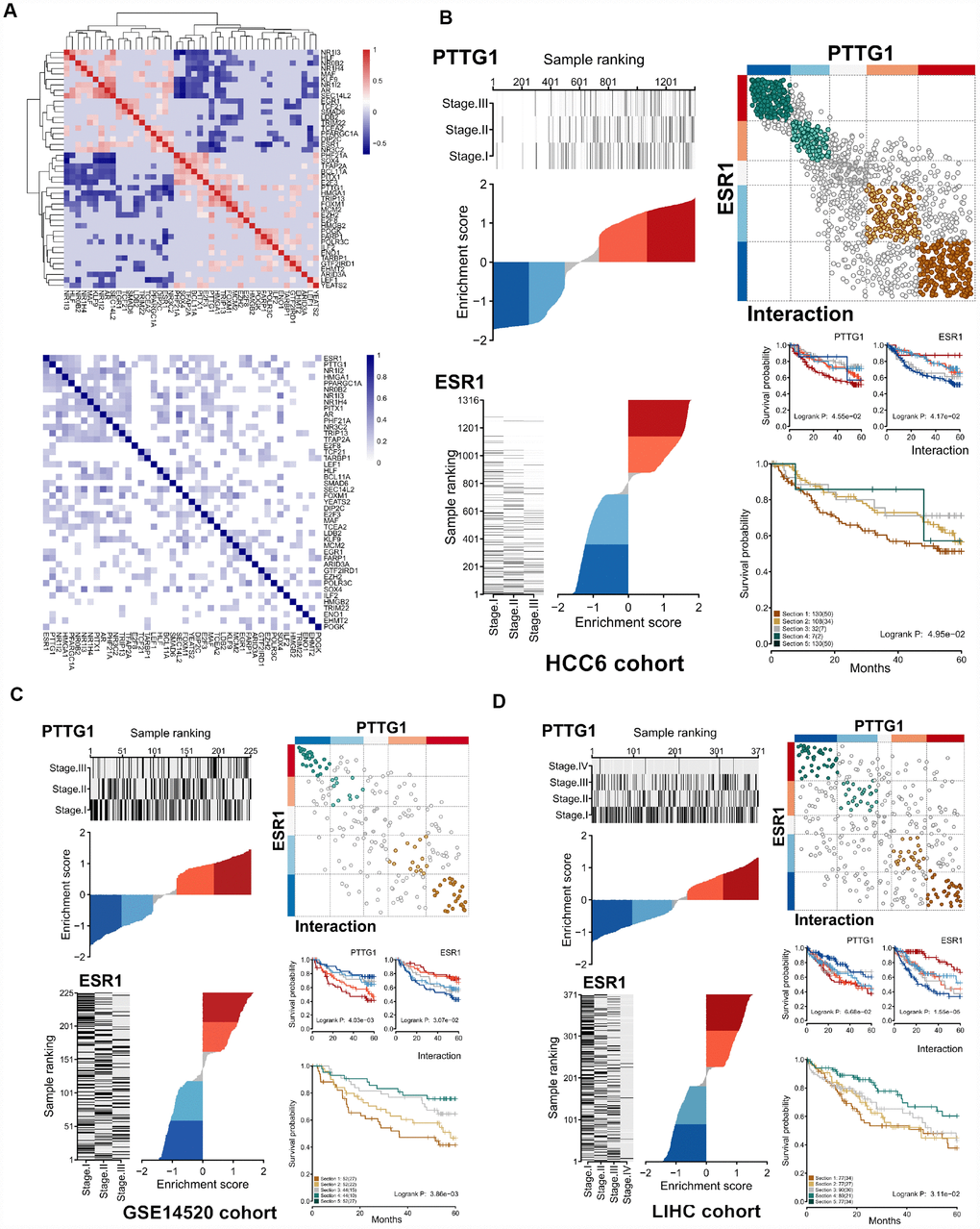 Generally, JC values fell into two distinct groups with high correlation within each group: gene targets shared between two MRs in the same group are regulated in the same direction by both MRs, whereas gene targets shared between a MR in one group and a MR in the other are regulated in opposite directions. This suggests the existence of two distinct regulatory MR groups, each one opposing the effects of the other. Again, using ESR1 and PTTG1 as an example, these two MRs were highly anti-correlated and showed extensive overlap (R = -0.586, JC = 0.431). Considering compounding effect, stratification of activity of interacted-ESR1 and PTTG1 regulon further reveals different survival patterns. This influence was verified in the LIHC and GSE14250 cohorts (Figure 7C–7D).