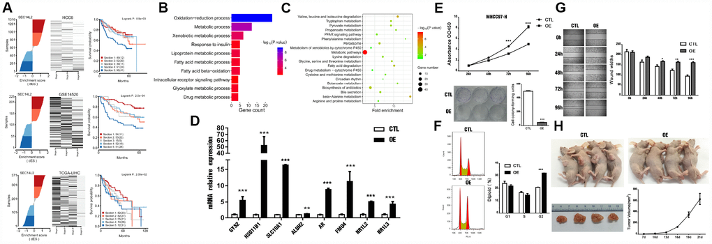 As expected, expression of the component genes like GYS2, HSD11B1, SLC10A1, ALDH2, and AR, etc, in SEC14L2 regulon were significantly up-regulated after the ectopic expression of SEC14L2 in MHCC-97H cells (Figure 8D). Briefly, GYS2 was recently found to be responsible for the deregulation of glycogen metabolism in HCC [37]. HSD11B1 was identified as a circulating biomarker candidate for HCC [38]. SLC10A1(NTCP) expression was markedly reduced in most HCC [39]. ALDH2 deficiency promotes liver cancer by activating oncogenic pathways via oxidized DNA-enriched extracellular vesicles [40]. These results suggested that SEC14L2 regulon might have a positive mechanism in metabolic pathways regulated by SEC14L2.
