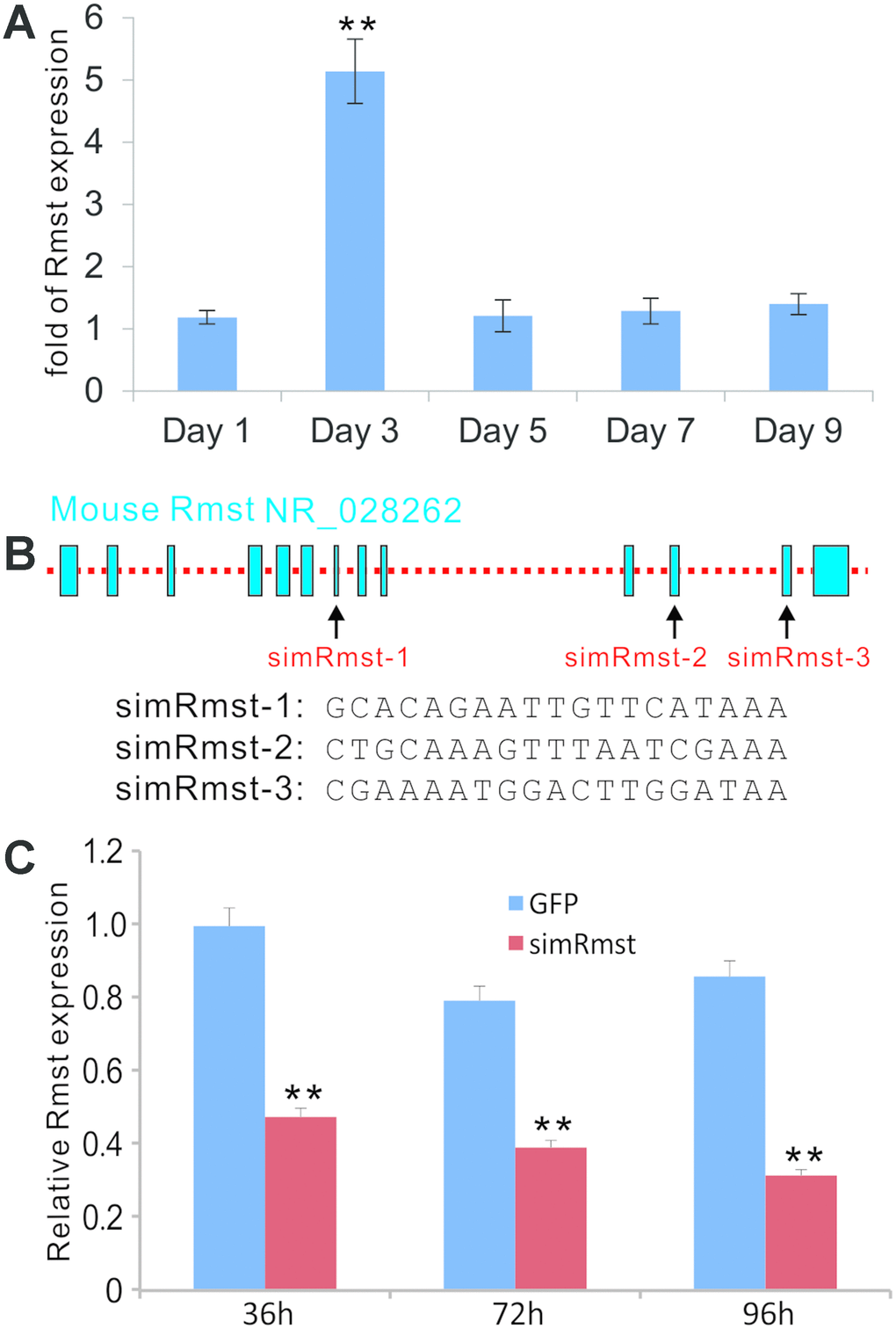 LncRNA Rmst was originally identified as a marker for the developing dopaminergic neurons in mouse [50] and has been shown indispensable for neurogenesis [45, 46]. Recent studies indicate that a trans-spliced tsRMST inhibited human embryonic stem cell differentiation [51], and RMST has been also implicated possessing a tumor suppressor role in triple-negative breast cancers [52, 53]. Thus, the biological functions of lncRNA Rmst remains largely elusive.