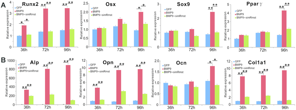 As we previously showed that BMP9 can effectively induce tri-lineage (osteogenic, chondrogenic and adipogenic) differentiation in MSCs [22, 29, 30, 54], we tested whether silencing Rmst would impact the BMP9-induced expression of these lineage-specific regulators in MSCs. When iMADs cells were infected with Ad-BMP9, osteogenic regulator Runx2 expression was significantly up-regulated at 36, 72 and 96 hours after infection, while Runx2 downstream target Osx was up-regulated at 96h time point (Figure 2A). However, co-infection of AdR-simRmst effectively blunted BMP9-induced expression of both Runx2 and Osx (Figure 2A). Similarly, BMP9-induced expression of chondrogenic regulator Sox9 and adipogenic regulator Pparγ was also effectively diminished by AdR-simRmst co-infection (Figure 2A), suggesting that Rmst may be an important mediator of BMP9-induced multiple-lineage differentiation of MSCs.