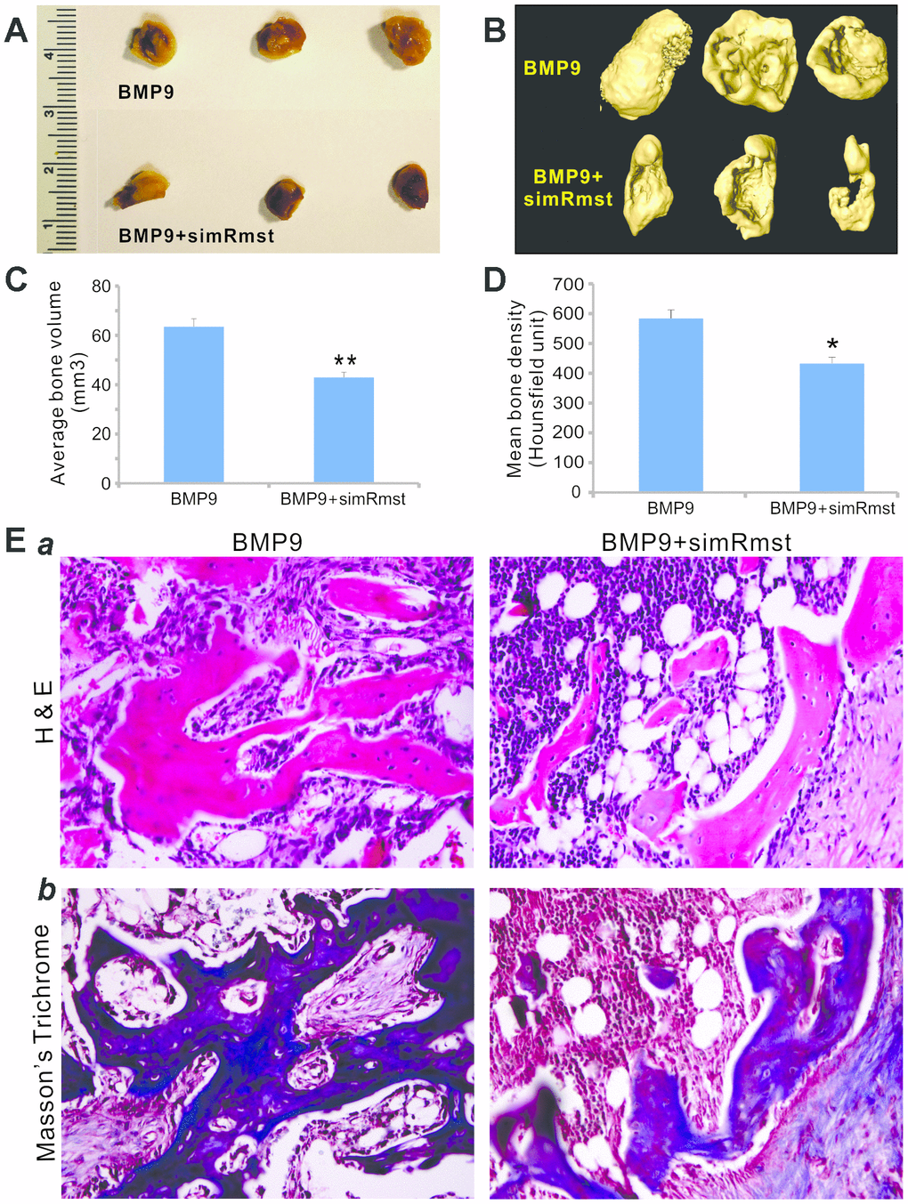 We determined whether Rmst knockdown in MSCs would impact BMP9-induced bone formation in vivo. When the iMADs cells were co-infected with Ad-BMP9, Ad-GFP, and/or AdR-simRstm and collected for subcutaneous injection into the flanks of athymic nude mice. Bony masses were successfully retrieved from both Ad-BMP9 and Ad-BMP9+AdR-simRmst groups at 4 weeks after implantation (Figure 4A) although no masses were detected in the Ad-GFP or AdR-simRmst group (data not shown). However, microCT analysis indicated that the average bone volume and mean bone density were significantly lower in the Ad-BMP9+AdR-simRmst group, compared with that of the Ad-BMP9 group (Figures 4B–4D).