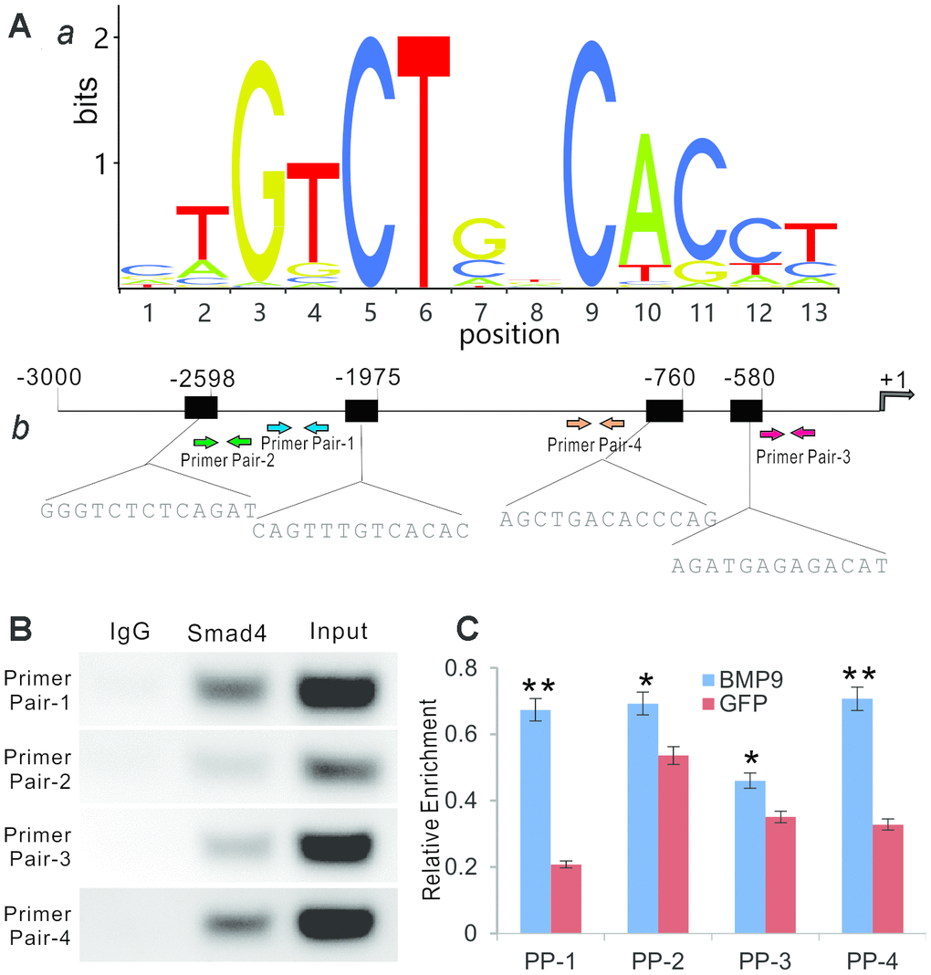 To determine whether BMP9 regulates Rmst through the canonical Smad signaling pathway, we performed bioinformatic analysis of putative Smad4 binding motif sequences using JASPAR and identified representative position weight matrix for motif enriched in Smad4 binding sites in ChIP-seq database (Figure 5A, panel a). Four putative Smad4 binding sites were identified within the 3kb promoter region of mouse Rmst (Figure 5A, panel b).