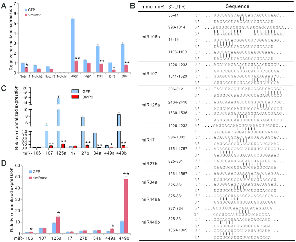 Bioinformatic analysis indicates that Rmst may harbor multiple binding sites for eight Notch-targeting miRNAs (Figure 6B). To determine whether these miRNAs were functionally relevant, we analyzed the expression of the eight miRNAs in MSCs upon BMP9 stimulation, and found that six of them, miR-107, miR-125a, miR-27b, miR-34a, miR-449a, and miR-449b, were significantly suppressed upon BMP9 stimulation (Figure 6C).