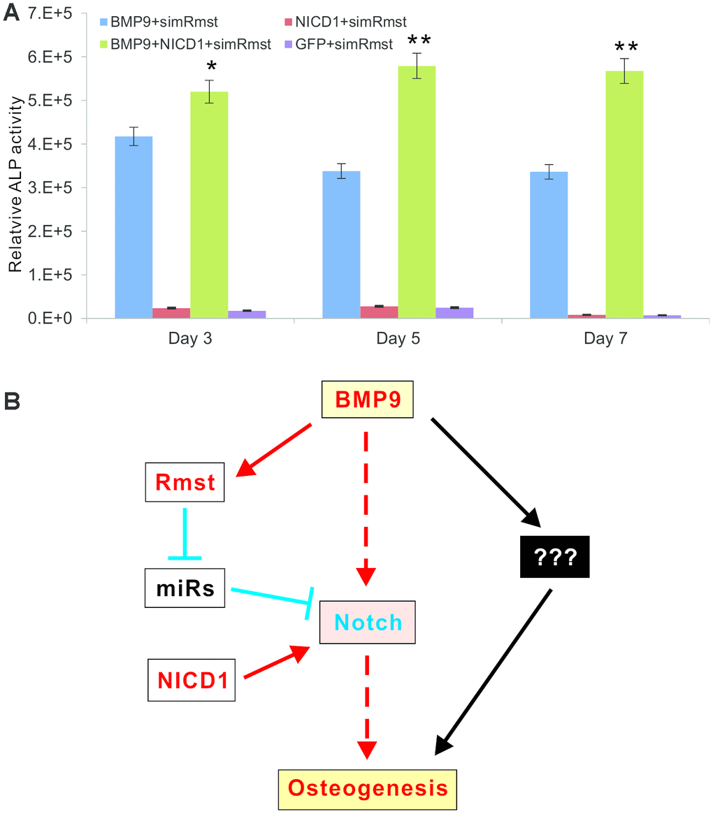 Lastly, we tested whether a constitutive activation of Notch signaling would rescue BMP9-induced osteogenic differentiation which was diminished by Rmst silencing. When the iMADs were co-infected with Ad-BMP9, Ad-GFP, Ad-simRmst, and/or Ad-NICD1, we found that exogenous expression of NICD1 effectively prevented the decrease in ALP activity caused by Rmst silencing; and in fact significantly increased ALP activity determined at 3, 5 and 7 days after infection (Figure 7A). Collectively, our results demonstrate that the Rmst-miRNA-Notch regulatory loop may play an important role in mediating BMP9-induced osteogenesis through Notch signaling.