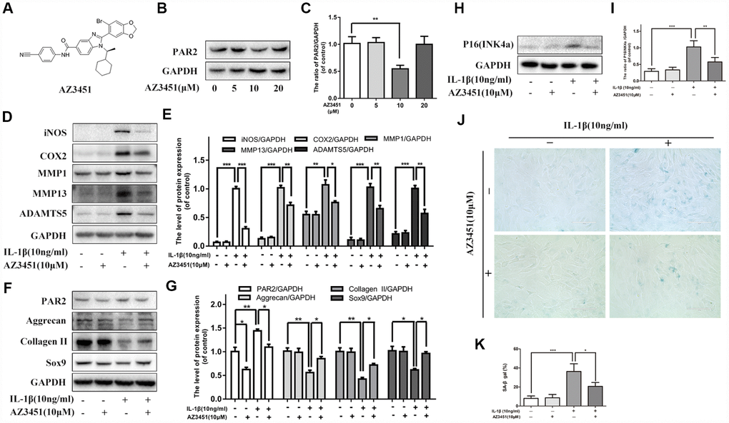 Given that PAR2 expression was up-regulated in OA articular cartilages, we further explored whether PAR2 antagonist could cure osteoarthritis in vitro. AZ3451, as shown in Figure 2A, is a potent antagonist which can bind to a remote allosteric site outside the helical bundle of the PAR2 [20]. We first detect the inhibitory effect of AZ3451 on PAR2 expression in chondrocytes. As shown in Figure 2B, 2C, 10 μM AZ3451 can effectively inhibit PAR2 expression in chondrocytes. To investigate the mechanism underlying the effects of PAR2 antagonist in OA, chondrocytes were stimulated with AZ3451 (10 μM) and IL-1β (10 ng/ml) for 48 h. As shown in Figure 2D, 2E, IL-1β increased the inflammatory cytokines and catabolic genes expression, including iNOS, COX2, MMP1, MMP13 and ADAMTS5, while treatment with AZ3451 alleviated this process. Furthermore, decreased Collagen II, aggrecan and SOX9 expressions induced by IL-1β were also inhibited by AZ3451 (Figure 2F, 2G). The cellular senescence level was detected by SA-β-gal staining and p16INK4a protein level. As shown in Figure 2H–2K, the IL-1β-treated chondrocytes exerted higher SA-β-gal activity and p16INK4a protein expression compared with the control group, while PAR2 antagonist AZ3451 significantly prevented this process.