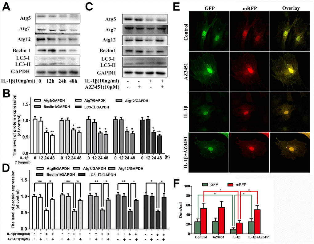 Increasing evidences indicated that autophagy was an important protective mechanism in OA development. We next verified whether PAR2 antagonist AZ3451 could regulate autophagy processes in chondrocytes. As shown in Figure 3A, 3B, IL-1β decreased the autophagy markers (Atg5, Atg7, Atg12, Beclin1 and LC3) expression in a time-dependent manner. While AZ3451 treatment remarkably reversed the decreased autophagy related genes expression induced by IL-1β (Figure 3C, 3D). In addition, the tandem GFP-RFP-LC3 adenovirus was utilized to confirm autophagy induction by form punctate that represented autophagosome formation. As shown in Figure 3E, 3F, after infection with the GFP-RFP-LC3 adenovirus, there was fewer red puncta under IL-1β stimulation in chondrocytes; However, AZ3451 treatment cells presented more red puncta. These results demonstrated that AZ3451 could enhance autophagosome conversion to autophagolysosomes, and thus promoting autophagy flux and autophagy level.