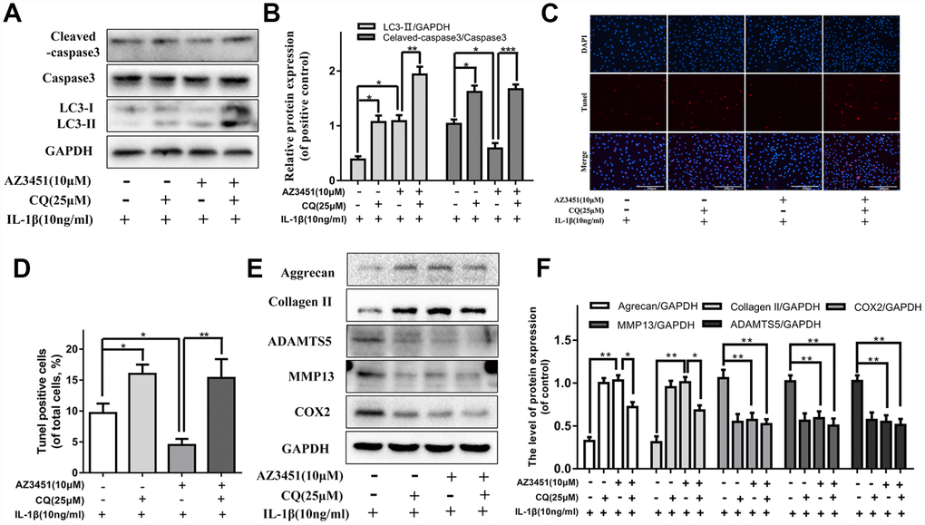 To investigate how autophagy interacted with anti-apoptotic effects of AZ3451, chloroquine (CQ), an autophagylysosome pathway inhibitor, was used to inhibit the downstream of autophagy flux in chondrocytes. As shown in Figure 5A, 5B, western blotting results showed that the IL-1β-mediated upregulation of cleaved caspase 3 was significantly attenuated by AZ3451, while inhibition of autophagy with CQ reversed the anti-apoptotic effect of AZ3451. Similarly, the reduction of the percentage of TUNEL positive cells was also markedly attenuated by CQ (Figure 5C, 5D). Taken together, the results indicated that autophagy was essential for the anti-apoptotic effect of AZ3451. To explore whether autophagy was associated with AZ3451-mediated chondrocyte metabolism, we measured the levels of main degeneration associated proteins (Aggrecan, Collagen, ADAMTS5, MMP13 and COX2). As shown in Figure 5E, 5F, CQ treatment decreased the increased the level of COX2, MMP13, ADAMTS5 and attenuated the degradation of collagen II and aggrecan induced by IL-1β. Combined AZ3451 and CQ treatment couldn’t inhibit the protective effect of AZ3451 in IL-1β induced catabolic factors (COX2, MMP13 and ADAMTS5). While we observed that the AZ3451 decreased degradation of collagen II and aggrecan was partially weakened in the presence of CQ. The results indicated that inhibition of autophagy with CQ weakened AZ3451-mediated prevention of cartilage matrix degradation without affected AZ3451-mediated catabolic processes.