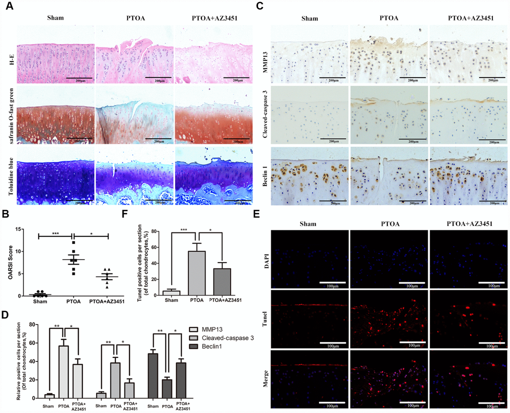 To investigate the effect of AZ3451 on the progression of OA in vivo, AZ3451 was injected into the knee joint of the rat OA model. Safranin-O staining was performed to access histomorphology differences among rat joints. As shown in Figure 7A, we observed the significant superficial articular cartilage erosion as well as the loss of proteoglycan in the PTOA group. In contrast, AZ3451 treatment group exerted the less cartilage damage and the richer proteoglycan compared to the PTOA group. The OARSI score also showed that AZ3451 intra-articular injection significantly alleviated OA progression (Figure 7B). We then determined the expression of MMP13, Cleaved-Caspase3 and Beclin1 in each group by immunohistochemistry. Consistent with vitro results, AZ3451 could increase the Beclin1 expression and decrease MMP13 and Cleaved-Caspase 3 expression in rat OA cartilage (Figure 7C, 7D). The apoptosis of chondrocytes in cartilage was estimated by TUNEL staining. The results showed that the PTOA group exerted higher proportion of chondrocytes apoptosis, while AZ3451 treatment reversed such pathological change (Figure 7E, 7F).