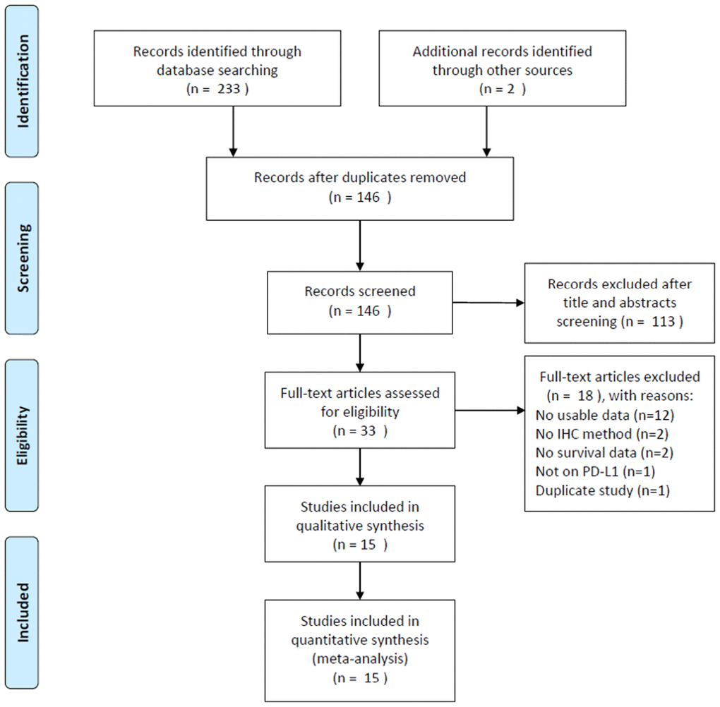 The process of literature selection is presented in Figure 1. The initial literature search revealed 235 records, and after removing the duplicate papers, 146 articles were subjected to further screening. After examining the title and abstract, 113 reports were discarded. Subsequently, the full text of the remaining 33 studies were evaluated, and 18 studies were excluded owing to the following reasons: 12 studies did not provide usable data, 2 studies did not employ the IHC method, 2 studies did not provide any survival information, 1 study did not focus on PD-L1, and 1 study was overlapped. Finally, a total of 15 studies [11–25] comprising 1,776 patients were included for the meta-analysis.