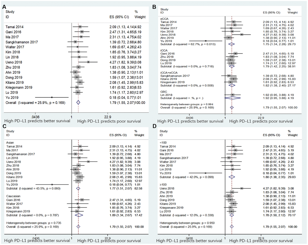 Although we strictly performed this meta-analysis according to the PRISMA guidelines and selected eligible studies with uniform criteria, the study has several limitations. First, although all included studies used IHC to detect PD-L1 expression, the cut-off values defining low/high PD-L1 levels were different, which may result in heterogeneity. Second, in studies that enrolled patients with iCCA+eCCA [14, 22, 23], the researchers did not report PD-L1 expression for iCCA and eCCA separately. Therefore, the data were extracted from those studies by including the patients with iCCA and eCCA as a whole group. Third, only one study with patients with GBC [17] was included in the analysis. Although we searched the literature by using keywords containing gallbladder cancer, only one study of GBC was included finally. Therefore, the prognostic impact of PD-L1 in patients with GBC could not be sufficiently explored. Fourth, all included studies were retrospective. Although we did not limit the eligible studies to be retrospective or prospective; the included studies were retrospective after literature selection. More prospective studies on this issue are still needed in the future.