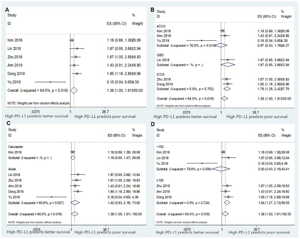 Six studies with 662 patients provided the HRs for DFS [16, 17, 19–21, 25]. Because of significant heterogeneity (I2=65%, p=0.016), a random-effects model was applied. The pooled HR indicated that the correlation between PD-L1 expression and DFS was not significant (n=6, HR=1.38, 95% CI=1.00–1.91, p=0.051; Table 2 and Figure 3A). Subgroup analysis revealed that PD-L1 overexpression was associated with worse DFS in patients with iCCA (n=2, HR=1.76, 95% CI=1.28–2.42, p<0.001) and in studies with sample size ≥100 (n=3, HR=1.64, 95% CI=1.27–2.13, p<0.001; Table 2 and Figure 3B). However, high PD-L1 expression was not predictive of poor DFS in Asian and Caucasian patients (Table 2 and Figure 3C), in patients with eCCA and GBC (Table 2 and Figure 3B), and in studies with sample size <100 (Table 2 and Figure 3D). The pooled data also indicated that PD-L1 overexpression remained a significant prognostic factor for DFS using various cut-off values of PD-L1 (Table 2 and Supplementary Figure 1B).
