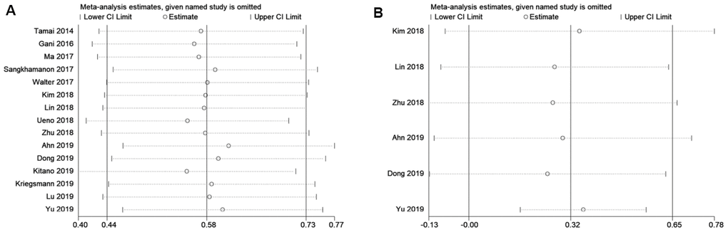 Sensitivity analysis was performed to evaluate the stability of pooled HRs for OS and DFS. As shown in Figure 4, the results of the sensitivity analysis demonstrated high credibility of the pooled HRs. Meta-regression analysis showed that tumor type (p=0.820), ethnicity (p=0.783), sample size (p=0.960), and cut-off value (p=0.166) did not significantly contribute to heterogeneity of OS (Table 2). Similarly, meta-regression analysis also indicated that tumor type (p=0.271), ethnicity (p=0.365), sample size (p=0.288), and cut-off value (p=0.425) did not significantly contribute to heterogeneity of DFS (Table 2).