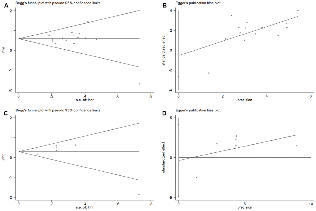 The Begg’s funnel plots and Egger’s test were used to estimate the potential publication bias. The results showed that there was no significant publication bias for OS on the Begg’s test (p=0.921, Figure 5A) and Egger’s test (p=0.581, Figure 5B). Similarly, the Begg’s test (p=0.452, Figure 5C) and Egger’s test (p=0.826, Figure 5D) indicated no significant publication bias for DFS.