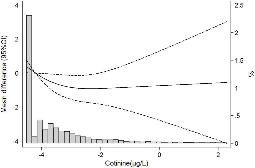 We first used frequency distributions to describe the distribution of participant characteristics by serum cotinine quartiles. Then, we depicted the distribution of serum cotinine and combined grip strength for participants, overall and by their main sociodemographic, lifestyle and clinical factors. To evaluate the association of serum cotinine with grip strength, we estimated the mean difference (95%confidence interval (CI)) in strength by quartiles of serum cotinine concentrations using linear regression models. Tests for trend were performed for ordinal serum quartiles in regression models using integer values (0 to 3). Next, to evaluate potential departures from linearity, we ran restricted cubic spline models with knots at the 10th (0.011 ng/mL), 50th (0.018 ng/mL), and 90th (0.0184 ng/mL) percentiles of cotinine distribution in all participants.